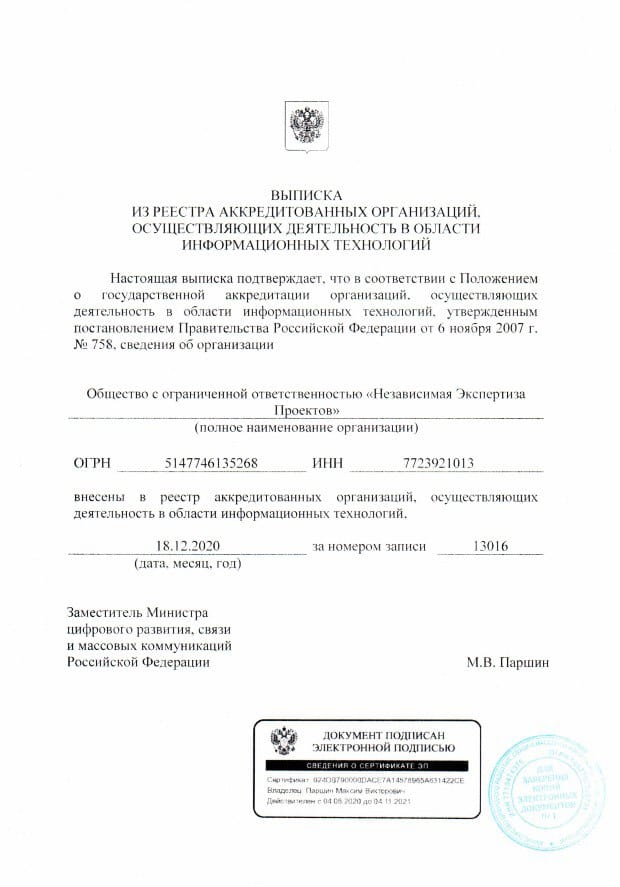 ООО «НЕЗАВИСИМАЯ ЭКСПЕРТИЗА ПРОЕКТОВ»ОГРН: 5147746135268ИНН: 7723921013 КПП: 771001001Состоит в реестре аккредитованных организаций, осуществляющих деятельность в области информационных технологий №13016 от 18.12.2020 года.